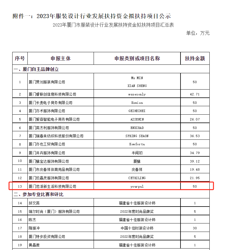 In the "Establishment of Xiamen Independent Brands" support project, the company’s brand "Yourpal" received a 500,000-yuan grant, in recognition of its social and economic benefits achieved since its establishment and its enormous potential for future market development.